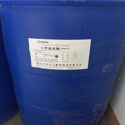 二甲基亞砜(DMSO)是一種含硫有機化合物,分子式為(CH3)2SO,常溫下為無色無臭的透明液體,具有吸濕性的可燃液體,既有高極性,高沸點,非質子,于水混溶的特性,毒性極低,熱穩定性好,能溶于乙醇,丙醇,苯和氯仿等大多、數有機物,被譽為“萬能溶劑”。