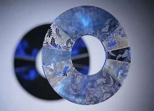 首飾設計作品《藍》的靈感來源于江蘇南通傳統非遺文化——藍印花布。整套作品的外形結構和佩戴方式靈感來源于古玉璧和傳統服飾。告別傳統藍印花布的制作材料和現成品,運用鈦、銀等金屬材料和有色亞克力的結合,以呈現藍印花布中最具特色的白底藍花和藍底白花。光線作用下,背底的亞克力板面上倒映出圖案和光影;再結合悶鑲鉆石的折射會豐富視覺上的層次;強調原有花紋中葫蘆、蓮花等吉祥圖案的美好寓意。整套作品的設計從藍印花布的基礎制作工藝上著手,結合金屬、鋯石、亞克力等現代材料,從傳統面料上剝離,將非遺文化活態化呈現,使其更具當代美學意味。