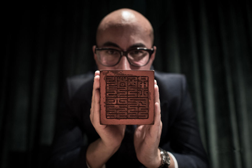 3月14日,香港蘇富比亞洲區副主席仇國仕展示康熙帝御寶“敬天勤民”檀香木異獸鈕方璽,該璽將于4月6日中國藝術品春拍期間拍賣,起拍價估計為1500萬美元。