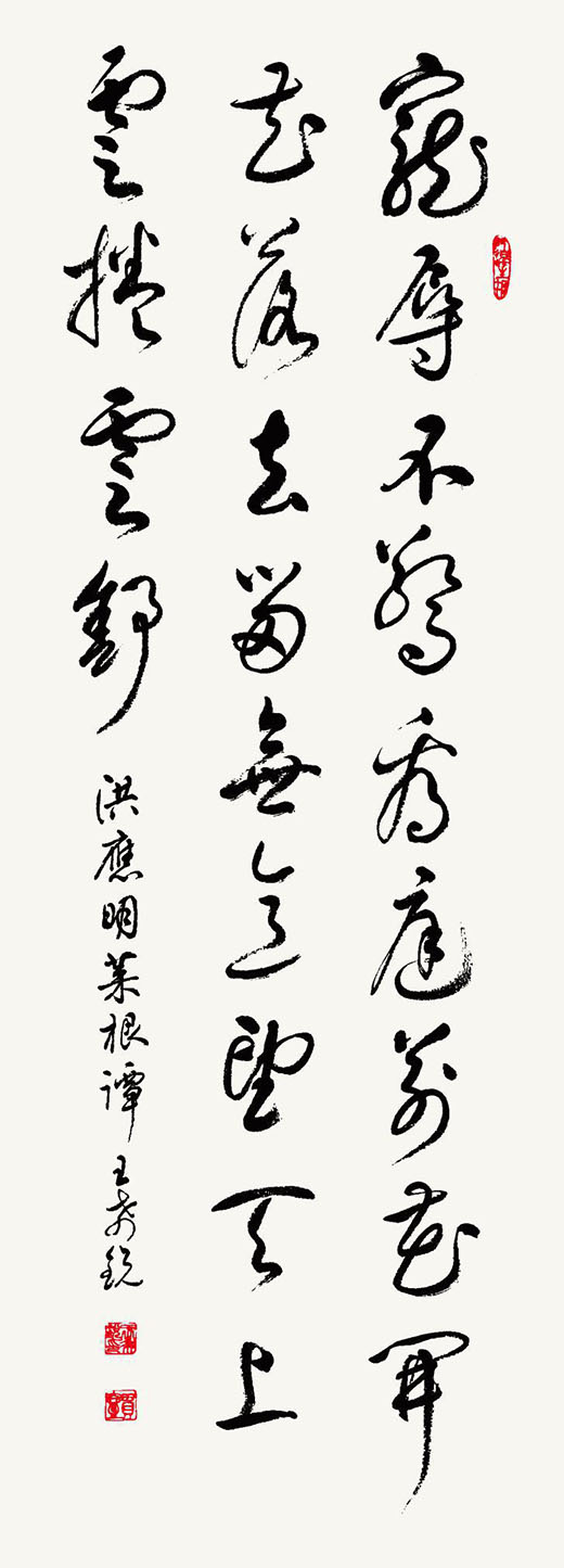 在他看來,書法的基本元素是點畫,故而書法創作若言“個性”,首先便需要表現出獨具特色的點畫語言。在他的作品中能夠看到其不斷嘗試用筆師法古帖的率真與暢達,并在師法過程中間或糅雜以行草之特有的灑脫飛揚之感。從用筆來看,王先生的運筆過程婉通圓健,寫行草如寫篆隸,盡量不失用筆的沉著氣息。此外,為了充分調動不同點畫的藝術表現功能,同時也為了將用筆的豐富性、結字的豐滿性相關聯,王希銳先生時常獨到地將點畫的邊界加以模糊,以點代面,或以線代點,面線結合。點、線、面之間的相映成趣,成就了其特有之新奇,這便是其風格創作的思想基礎。而在此基礎上的風格統一便不僅僅是一種形式上的新奇,更是基于內心對點畫深刻理解之后的藝術探索,故不能簡單以“個性”代之。