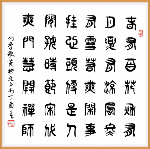 他修煉篆書,有著非常開闊的廣納視野,在碑學嚴謹的基礎上,左右尋源,前后取法,不把篆書作為孤立的存在而進行呆板的復現,而是把篆書當成一個可以繞而公轉的文化核心,不斷把甲骨文、鐘鼎、隸書、魏碑、楷書、行草等等諸多形體的筆法結合進篆書的創作,讓篆書一體在核心的位置上又持有開放的境界,融會貫通,再書奇觀。所以,我們看他的篆書在結體對稱法度嚴謹的基礎上,會顯觀筆法和墨韻的豐富多彩。