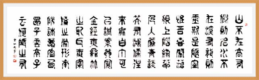 不遺余力修文化,功成高古傳龍脈。他的篆書整體觀感結體中正端莊,用筆平穩流暢,墨顯氣韻生動,在簡捷爽約中寫氣魄宏大,舉重若輕,流利飄逸。篆書傳承秦風的威嚴,又加注個人書風的雄奇神采,仰觀筆墨入廟堂,徑入強勁最骨力,作為諸書之祖,顯成千古不易之法!
