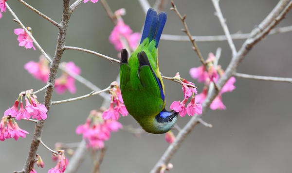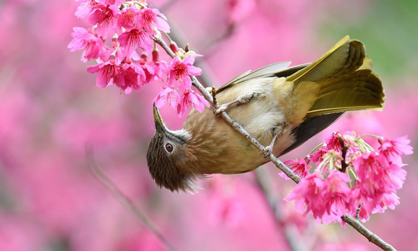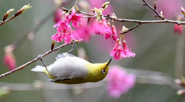 2月18日,一只繡眼鳥在福州森林公園櫻花園采食花蜜。隨著天氣轉暖,福州國家森林公園的2.5公頃櫻花園內櫻花盛開,引得眾多鳥兒前來采食花蜜,春色盎然。