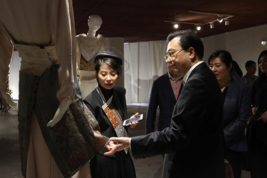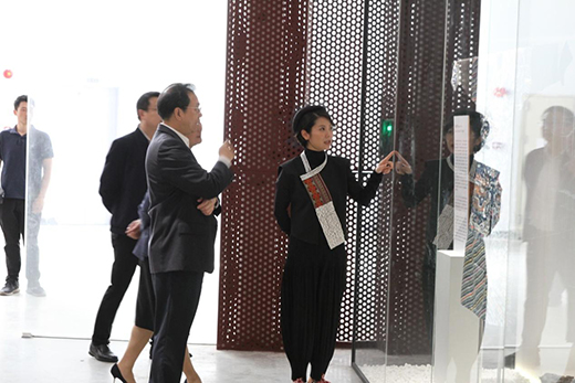 趙卉洲為出席開幕式的領導嘉賓講解非遺織錦展展出民族織錦的時尚化設計表達