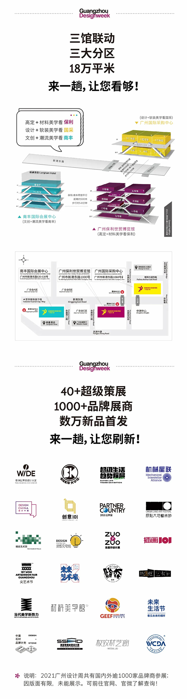 2021廣州設(shè)計(jì)周展覽規(guī)模達(dá)到18萬(wàn)㎡,較2020年的15萬(wàn)㎡又增大了3萬(wàn)㎡,在去年“廣州保利世貿(mào)博覽館+廣州國(guó)際采購(gòu)中心”的基礎(chǔ)上新增一座展館——“南豐國(guó)際會(huì)展中心”,展覽規(guī)模進(jìn)一步擴(kuò)大,更多品牌、更多活動(dòng)以及更多元的超級(jí)策展將會(huì)在三座展館中誕生,形成了“三館聯(lián)動(dòng)、更大規(guī)模、更多內(nèi)容、更富商機(jī)”的展會(huì)大格局,妥妥的亞洲設(shè)計(jì)產(chǎn)業(yè)第一規(guī)模大展。