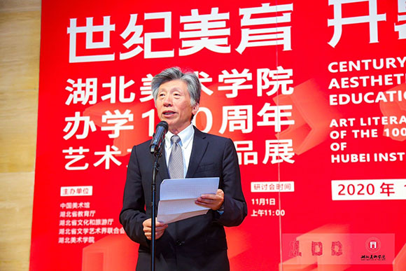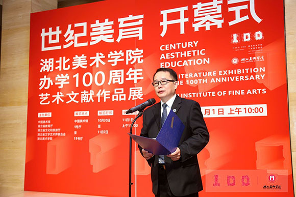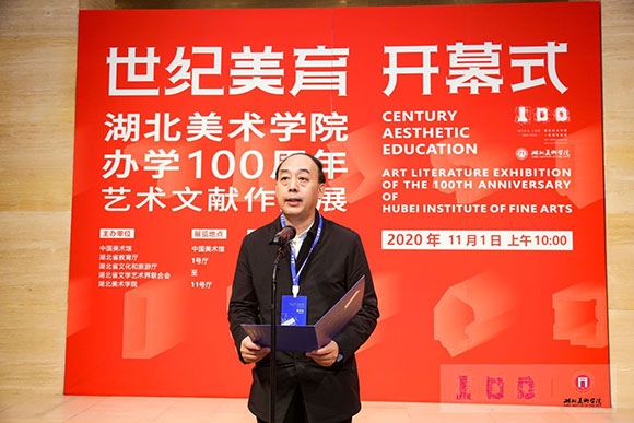 開幕式上,湖北美術(shù)學(xué)院黨委副書記、院長許奮從1920年蔣蘭圃、唐義精、徐子珩三位先賢創(chuàng)辦武昌美術(shù)學(xué)校開始,系統(tǒng)回顧了學(xué)校百年辦學(xué)歷程,講述了百年來湖北美術(shù)學(xué)院矢志美育,始終與祖國和人民共命運(yùn)、與時代和社會相偕行的辦學(xué)宗旨,熔鑄和傳承“兼收并蓄”的學(xué)術(shù)精神和“兼容互動”的教學(xué)理念,以及堅持文化傳承與使命擔(dān)當(dāng),在實(shí)踐中進(jìn)行教學(xué)改革,在關(guān)注時代下服務(wù)社會所做的努力和成就。同時,許奮院長還講到,在下一個百年,湖北美術(shù)學(xué)院將以蔡元培先生題詞“推行美育”為激勵,牢記習(xí)近平總書記“以大愛之心育莘莘學(xué)子,以大美之藝?yán)L傳世之作”的殷切希望,繼續(xù)發(fā)揚(yáng)以藝戰(zhàn)“疫”中與國家和民族共進(jìn)退的“硬核”擔(dān)當(dāng),發(fā)揚(yáng)眾志成城抗擊疫情的壯志豪情和同舟共濟(jì)守望相助的家國情懷,不忘初衷,篤篤前行,進(jìn)一步為中國高等美術(shù)教育事業(yè)貢獻(xiàn)自己的力量。