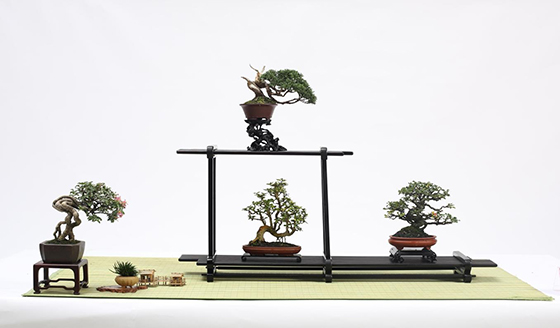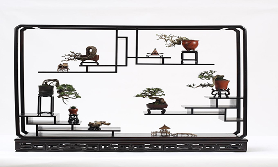 本次盆景精品展從5月23日上午9點半開幕,將于5月25日閉幕,為期三天。所展作品以小品盆景為主,共120組,中大型盆景20盆作為輔助點綴。結合茂盛山房園林古樸自然的環境,小品盆景后置背景、中置中國古典邊框、內以每組盆景置于博古架上,營造古色古香的整體展覽氛圍。大中型盆景,置于展場各曲徑通幽之處,后置背景,側或配石、或屏風、或古典家具、或山野草,與展場壞境相互配合,營造高低、大小、遠近之藝術效果。