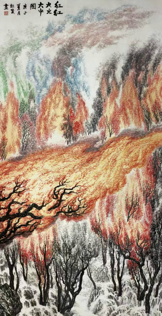 何起寶一直致力于佛法的學習和研究,如何把佛家積極、向上、美好的思想理念傳遞給觀眾始終是他最大的愿望。而“火”風格的創新題材與技法便無形中成了何起寶表達佛家思想理念的重要載體。萬物都有紅火的希望,而何起寶把“火”的創新風格融入傳統山水,希望通過“火”本身的寓意把追求紅紅火火、蒸蒸日上、希望、好運的思想想法傳遞給大家,也實現了他傳播佛家積極、美好、向上的愿望。